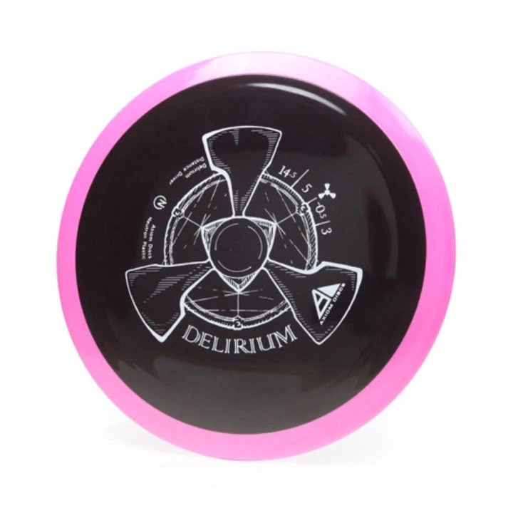 Make the competition feel delirious with the Axiom Neutron Delirium! The Neutron Delirium is an overstable distance driver designed for maximum speed and very overstable flights. The Delirium joins the Tantrum and Excite distance drivers as the overstable 24.5 MM Distance Driver making its debut in Neutron Plastic. Fans of the MVP Dimension will find a kindred spirit in the Delirium due to its capacity for high speed throws with minimal turn, even in high wind situations. Take the wind head-on with maximum distance drives from Axiom Discs Neutron Delirium Distance Driver!