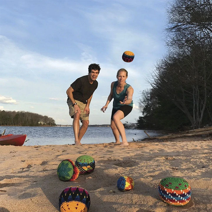 The ultimate travel game is now even more portable! The best of both worlds, our newest Bocce set is smaller and lighter than our ultralight Bocce set and can fit in your pocket! This kit comes with 2 sets of 4 matching Peloties, our classic mini hacky sacks. Play from family rooms to campsites, dorms to tailgates, backyards to beaches, break rooms to bars. Simply throw the Pallino (the 9th ball which is smaller and is the target) wherever you like and have at it – on the coffee or picnic table, under the chair legs, over your shoulder, wherever!