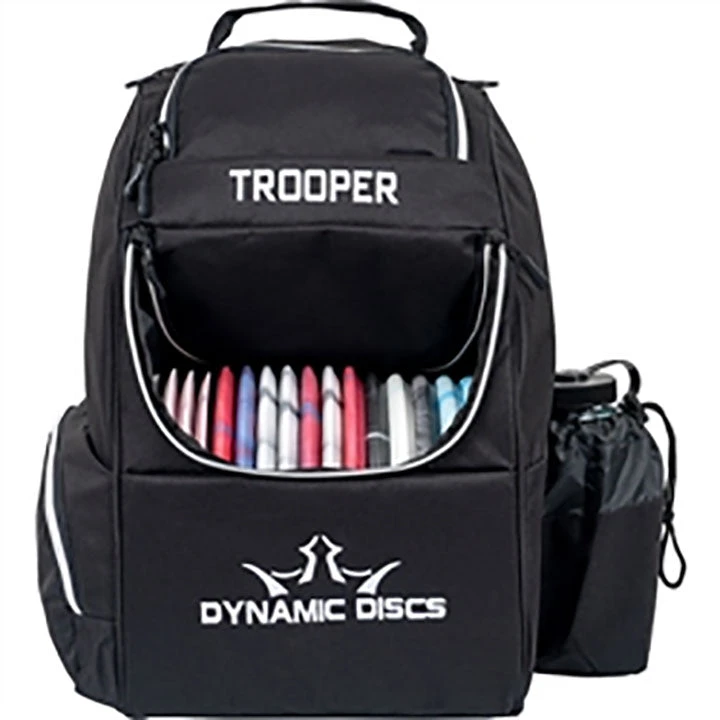 The Trooper bag provides suitable space to handle all of your disc golf needs. The Trooper can hold 18+ discs in its main compartment. It also has an upper compartment that can hold anything from more discs to articles of clothing. Featuring three additional pockets, the Trooper can handle all accessories needed for a full disc golf round. One side of the pack features a drawstring-enclosed water bottle holder and valuables pocket above. On the other side a larger side pocket is featured in addition to another valuables pocket above. Equipped with a padded set of straps as well as a padded back panel creating a very comfortable fit that is easy to carry for multiple rounds. Engineered with a low center of gravity, the Trooper is certain to keep your discs and other belongings upright.