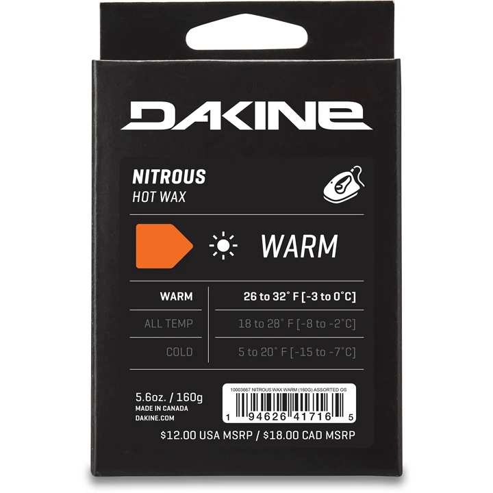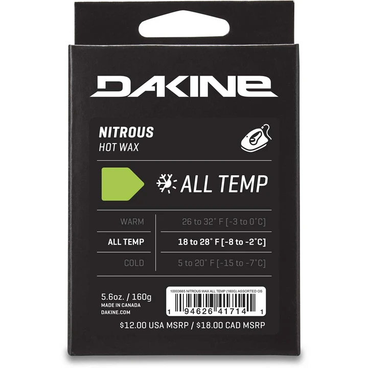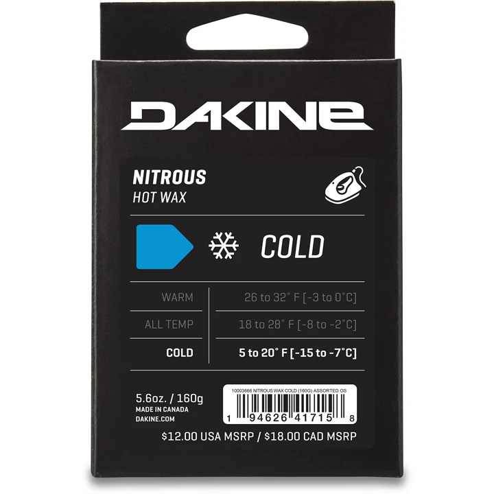 Dakine’s Nitrous Cold Wax is a quality blend of paraffin designed to improve ski and snowboard speed, and formulated to perform especially in cold weather conditions. Optimally designed for use as a hot wax, with an iron, we also made sure it would work as a rub on. Because let’s face it, sometimes you don’t have time to use an iron. And other times you just don’t have an iron.