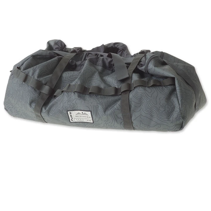 Large backpack duffel to store and carry gear (climbing rope, boat rope etc) to and from your everyday adventures, adjustable padded backpack shoulder straps with rope accents, fixed hand straps, webbing straps with side release buckles provide for a secure and compressed main compartment closure, side panel vertical rigging straps, detachable tarp for easy loading and to keep gear out of the dirt, one exterior zip pocket and one internal zip pocket, padded back panel.