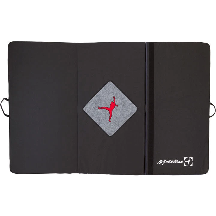 A massive 4′ x 6′ (1.2 m x 1.8 m), in an easy-carrying, tri-fold design. Sandwich foam design for maximum impact absorption: 1″ (25 mm) closed-cell, top layer, 2.5″ (60 mm) open-cell center, and ½” (15 mm) closed-cell, base layer. 900d body fabric for maximum durability and cross-clipper logo rug for cleaning shoes. Angle cut hinges eliminate the gutter found in other designs, and a small external stash pocket and larger inner pocket provide a place to store shoes, chalk bag, etc. Closure flap reverses to cover shoulder straps while bouldering. Plush padded shoulder straps and dual sets of drag handles give you lots of carrying options. Aluminum buckles are guaranteed for life. The Magnum also makes an awesome crag bed for car camping!