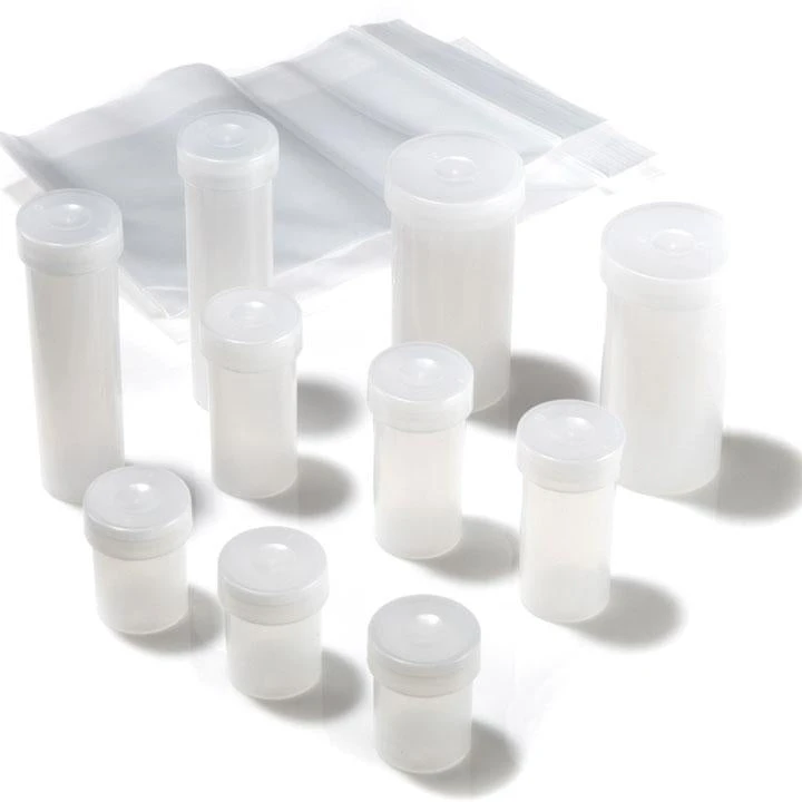 - Multisize polyethylene vials come packed in a reusable 5 x 8 in. zipper-lock bag