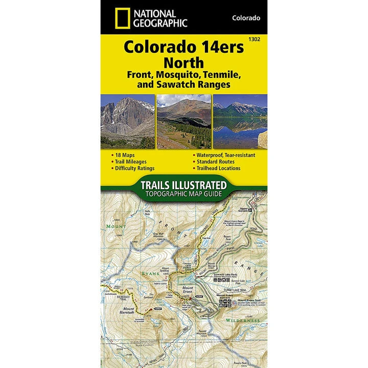 The Colorado 14ers North Topographic Map Guide provides the most accurate and convenient set of maps for the fourteeners of the Front, Mosquito, Tenmile, and Sawatch ranges of northern Colorado. Almost half of Colorado’s fourteeners fall in these ranges, but their proximity to large population centers leave no shortage of hikers on their slopes. Moderate ridges, established trails, and accessible trailheads are the norm on the standard routes, making many of these peaks relatively easy to climb. However, it’s important to note that these seemingly gentle giants also have their rugged side—including the north face of Mount Evans, the amphitheater north of Mount Democrat, Ellingwood Ridge on La Plata Peak, and the sheer east face of Longs Peak—placing them among the most challenging alpine experiences in the United States.