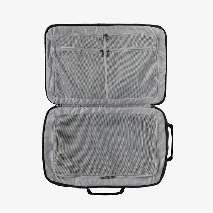 Clamshell design for the main zippered compartment features two separate chambers for easy packing, access and organization