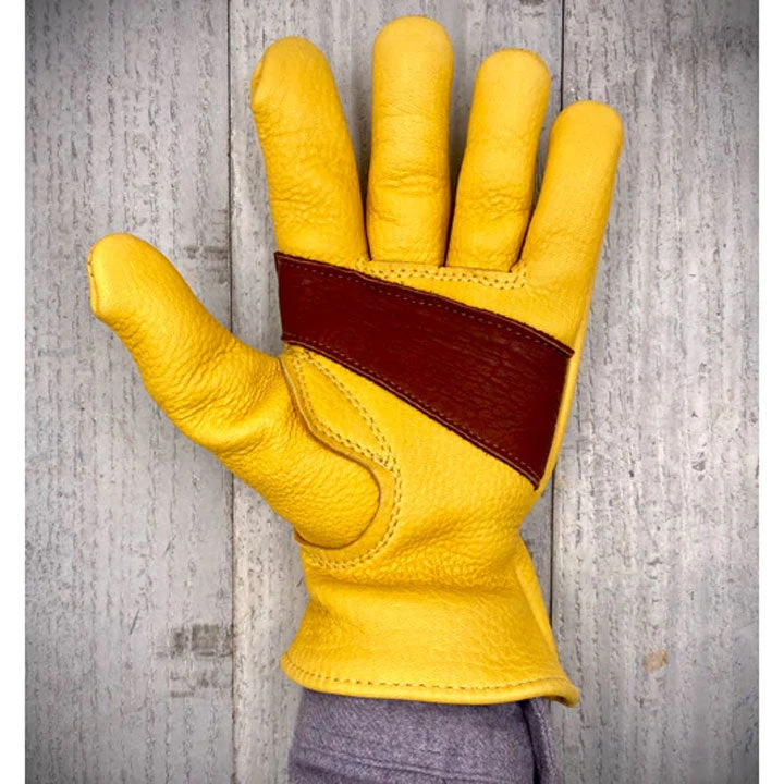 Straight Grain Supply Axe and Chore Gloves Elk with Buffalo Made in USA axe and chore glove purpose-built for heavy use. Naturally wind-proof and water-resistant. Gunn-cut cuff blocks out debris. Keystone thumb increases comfort and improves dexterity. Elk leather with buffalo leather palm patch which reinforces high-friction area. Premium core-spun thread provides superior seam integrity. American made from American materials