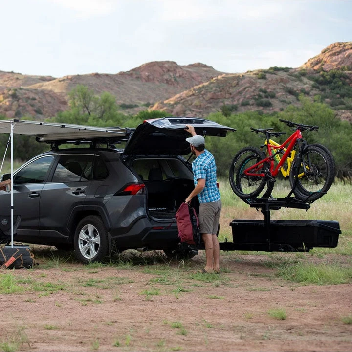 The two-bike EXO DoubleUp attaches directly to the EXO SwingBase or to the second tier EXO TopShelf allowing room for an EXO GearLocker or EXO GearWarrior below. Either way, it’s super easy access that accommodates anything you’re riding — fat tires to road bikes and everything in between.